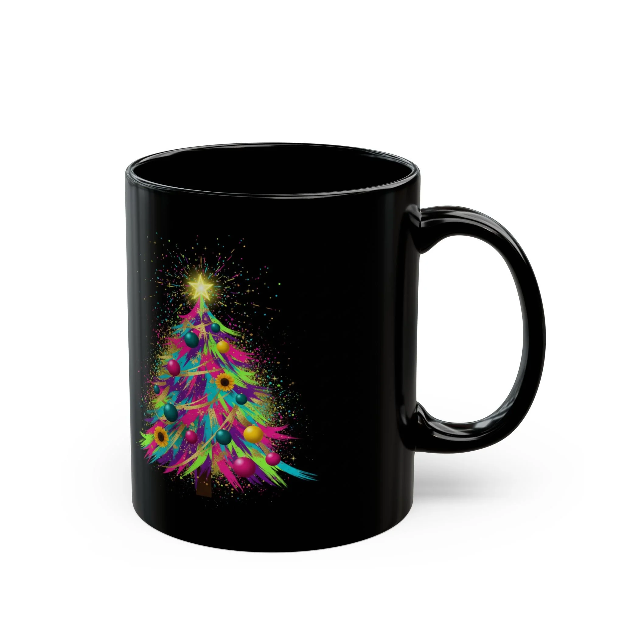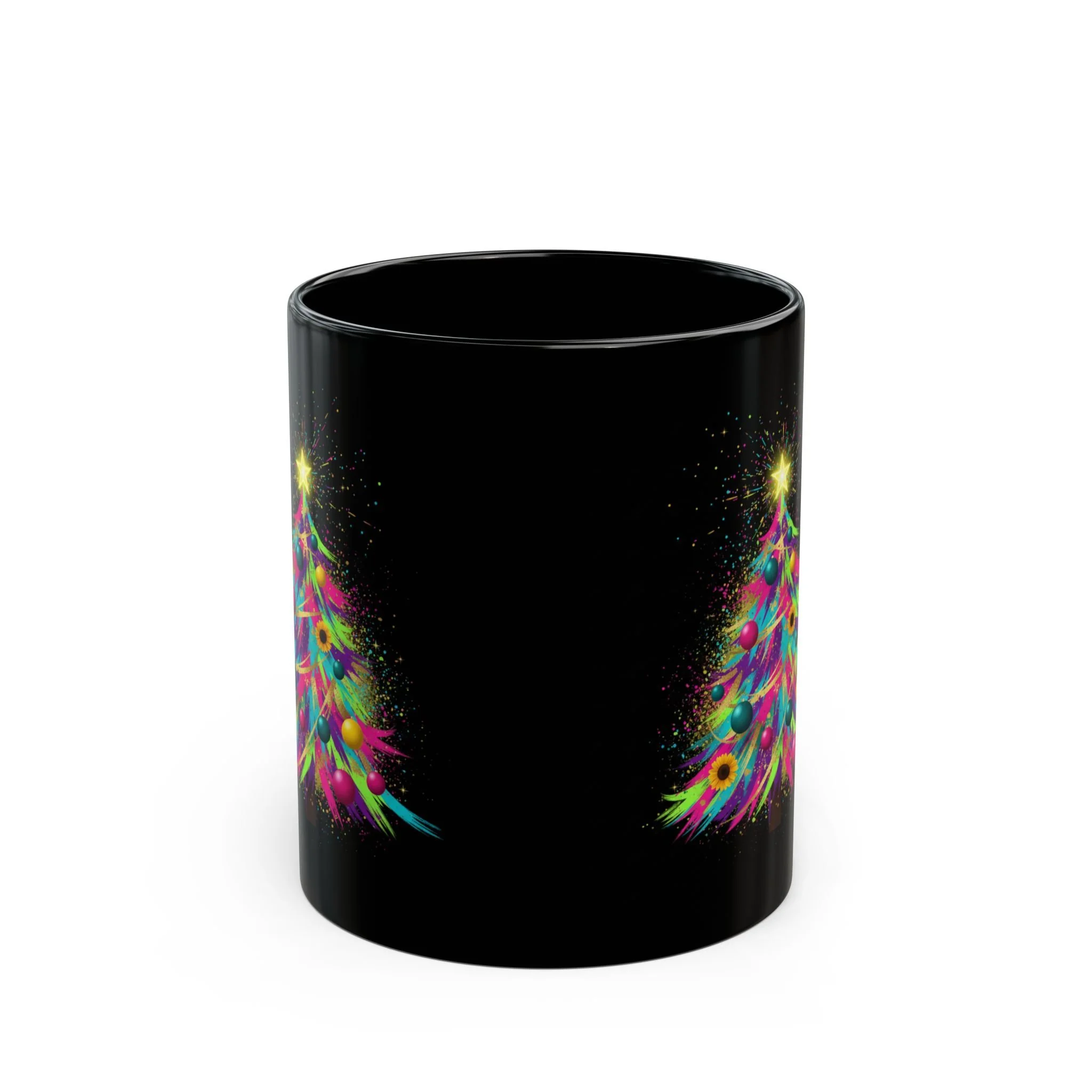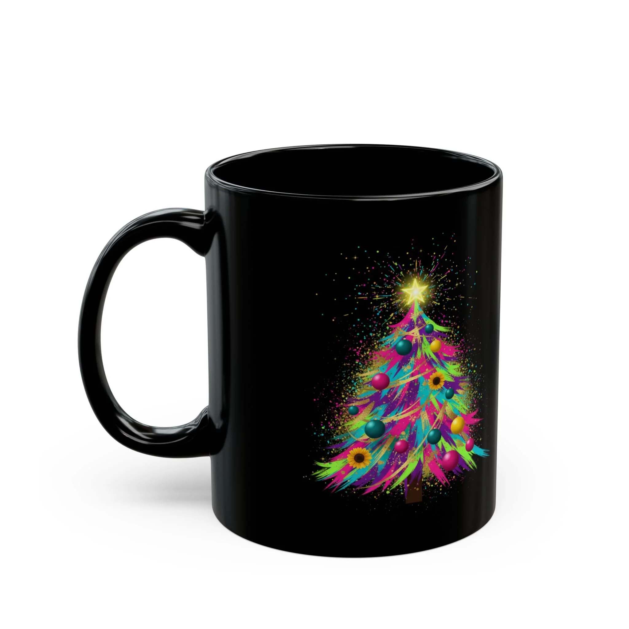 Sip in color and calm. This glossy black ceramic mug carries a vibrant, painterly tree rendered in neon hues and soft feather-like strokes. Against the deep black background the design seems to glow—sparkling star at the top, delicate bursts of color around each branch—making every morning coffee or late-night tea feel like a small, joyful ritual. The comfortable C-handle and smooth rim make it easy to hold and drink from, while the durable print keeps the artwork bright through daily use. It fits into routines where a little color and wonder matters: studio breaks, cozy reading nooks, or shared moments around the table.